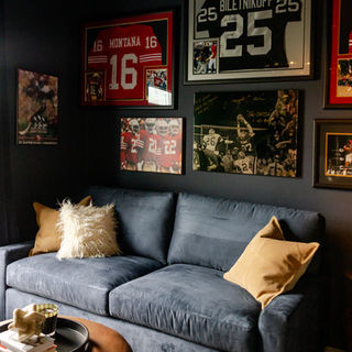 Personal memorabilia and signed autographs bring depth and story, grounding the room in individuality. A cowhide rug, layered textures, and a rich, dark palette complete the atmosphere: moody, intimate, and designed for late nights, conversation, and pause.